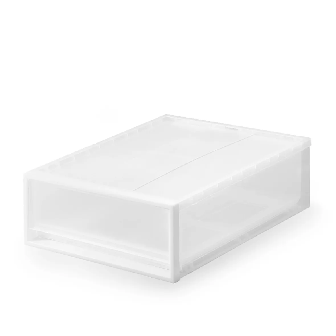 Boîte tiroir en PP (polypropylène). 44 x 55 x 18 cm. Empilable: jusqu’à 8 boîtes. Vous pouvez ajouter des pieds (ref 4945247554892) ou des roulettes (ref 4547315523788) dans les 4 trous prévus sous la boîte par un simple clic. Le polypropylène est un matériau translucide à forte densité extrêmement rigide et résistant.