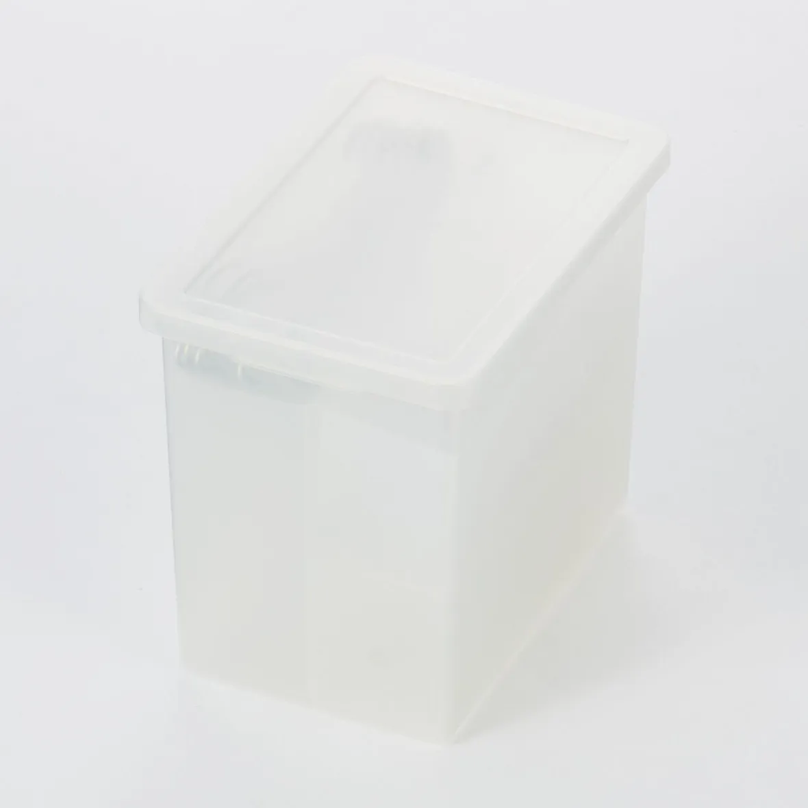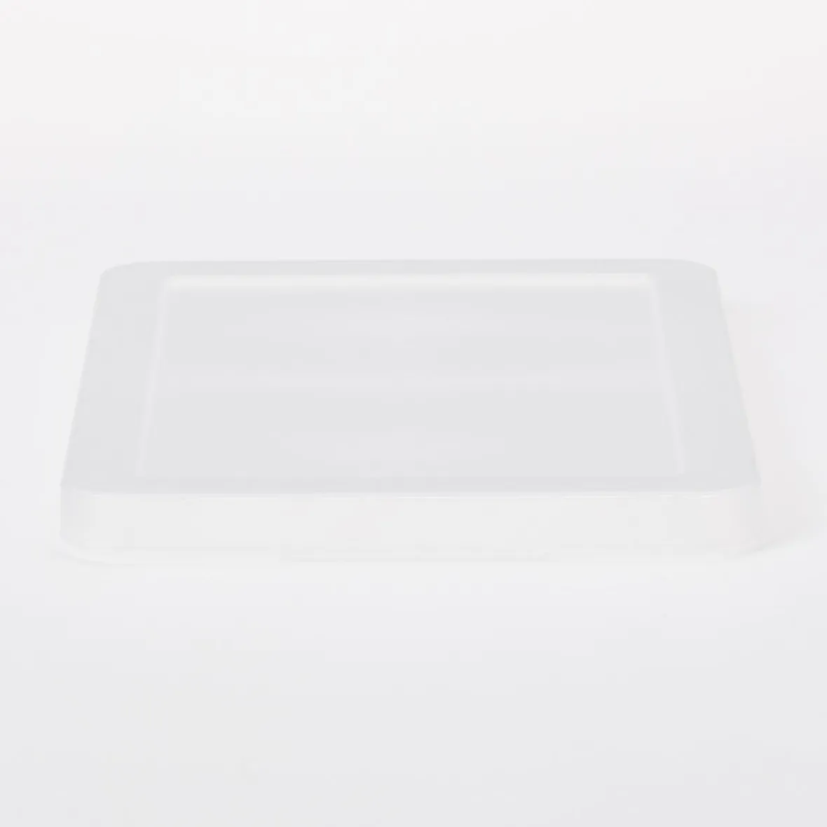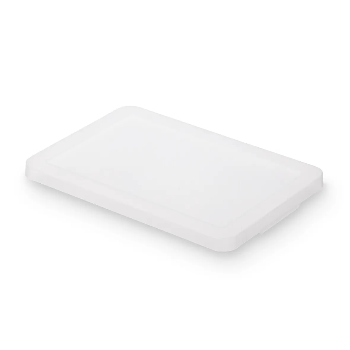 Couvercle pour boîte de rangement en polypropylène. Le rebord du fond de la boîte s’emboîte dans la rainure du couvercle, de sorte qu’il ne glisse pas lors de l’empilage.