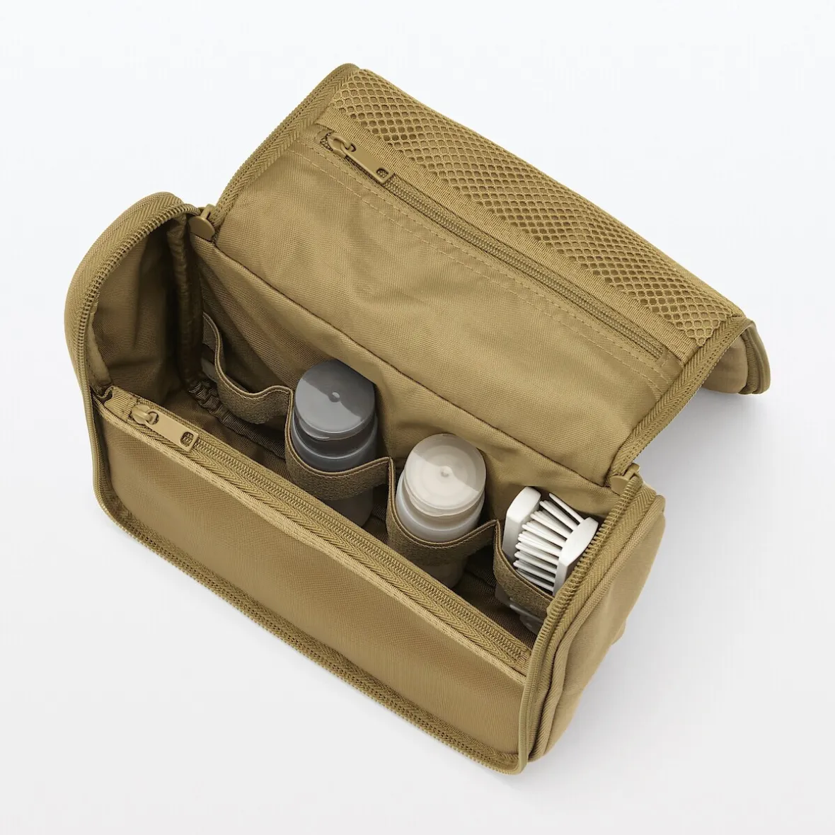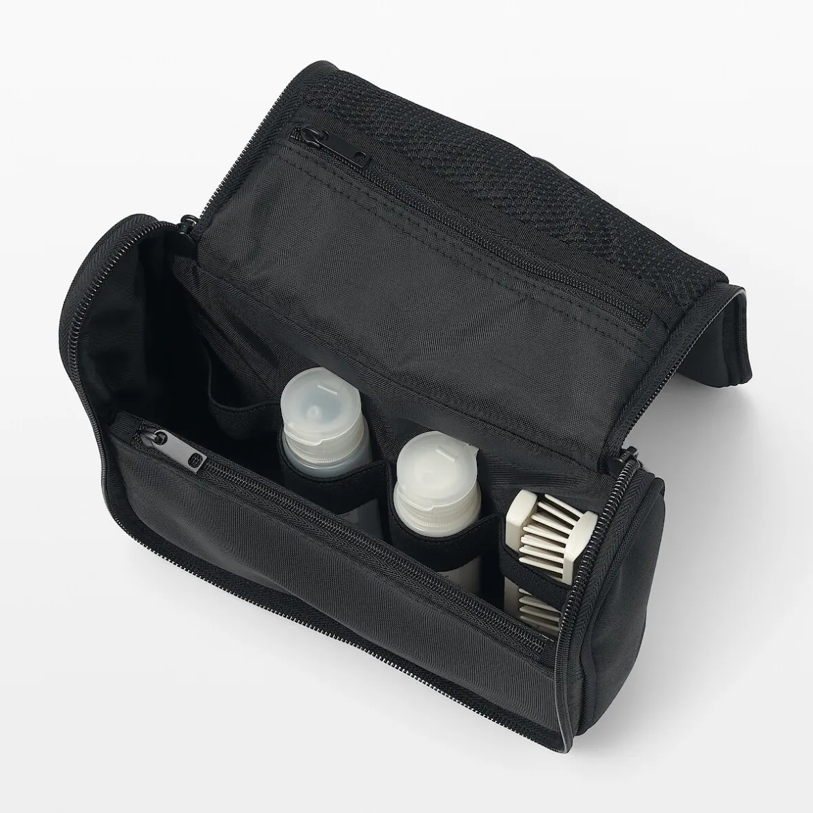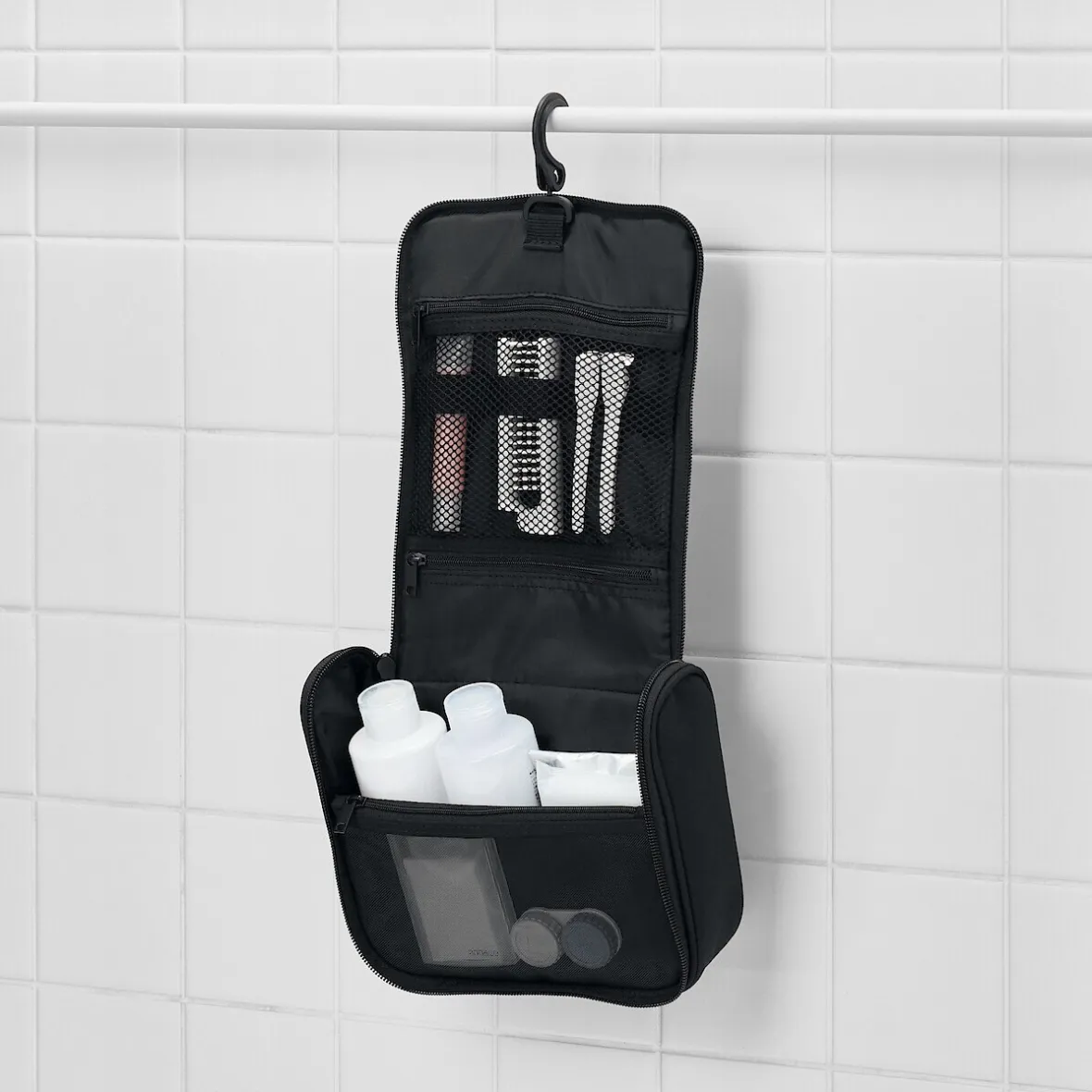Déplié, cet étui peut être utilisé pour l’accrocher à un crochet dans la salle de bain. Sa taille peut contenir jusqu’à 200 ml de bouteilles de lotion. Dimensions (fermé) : 16 x 19 x 6 cm