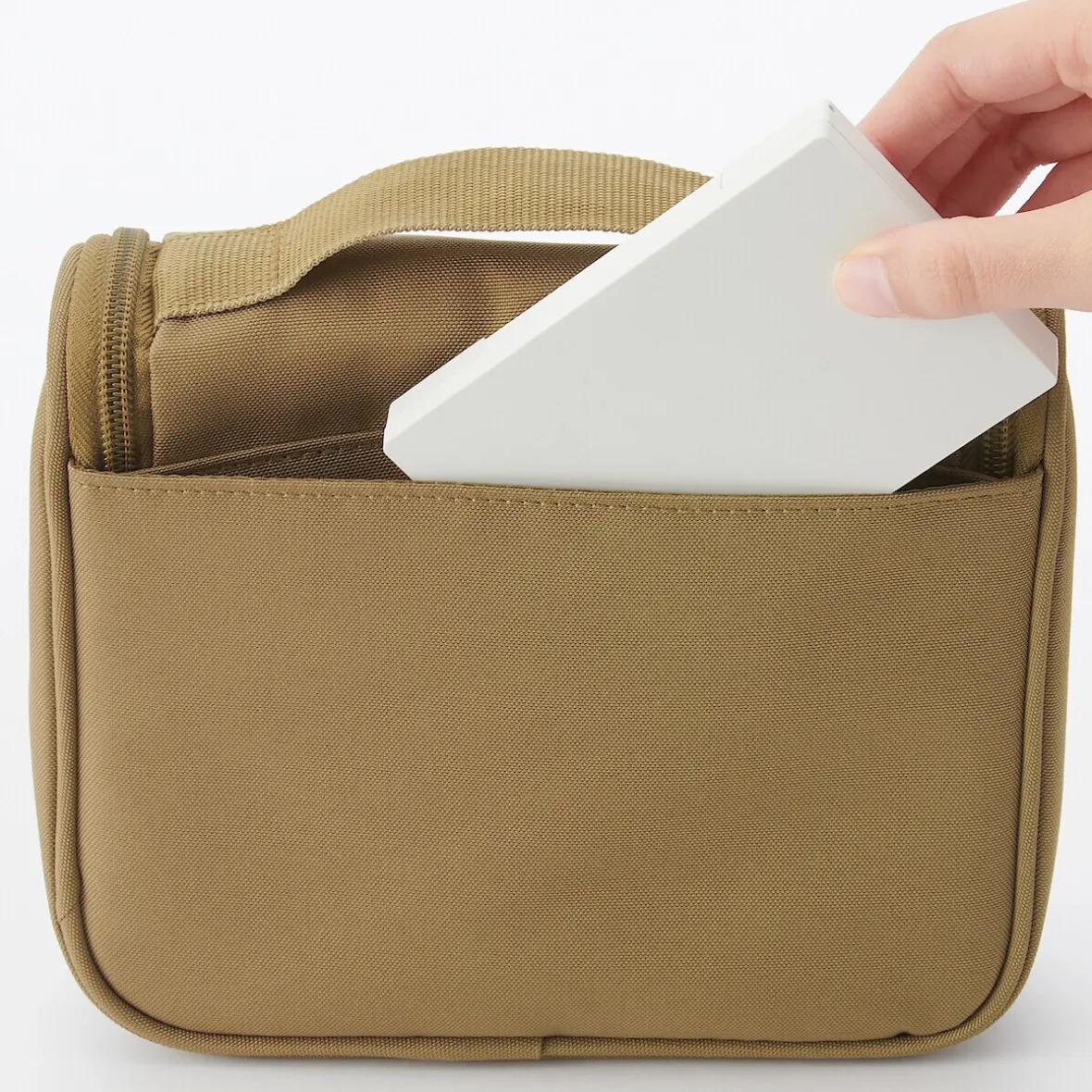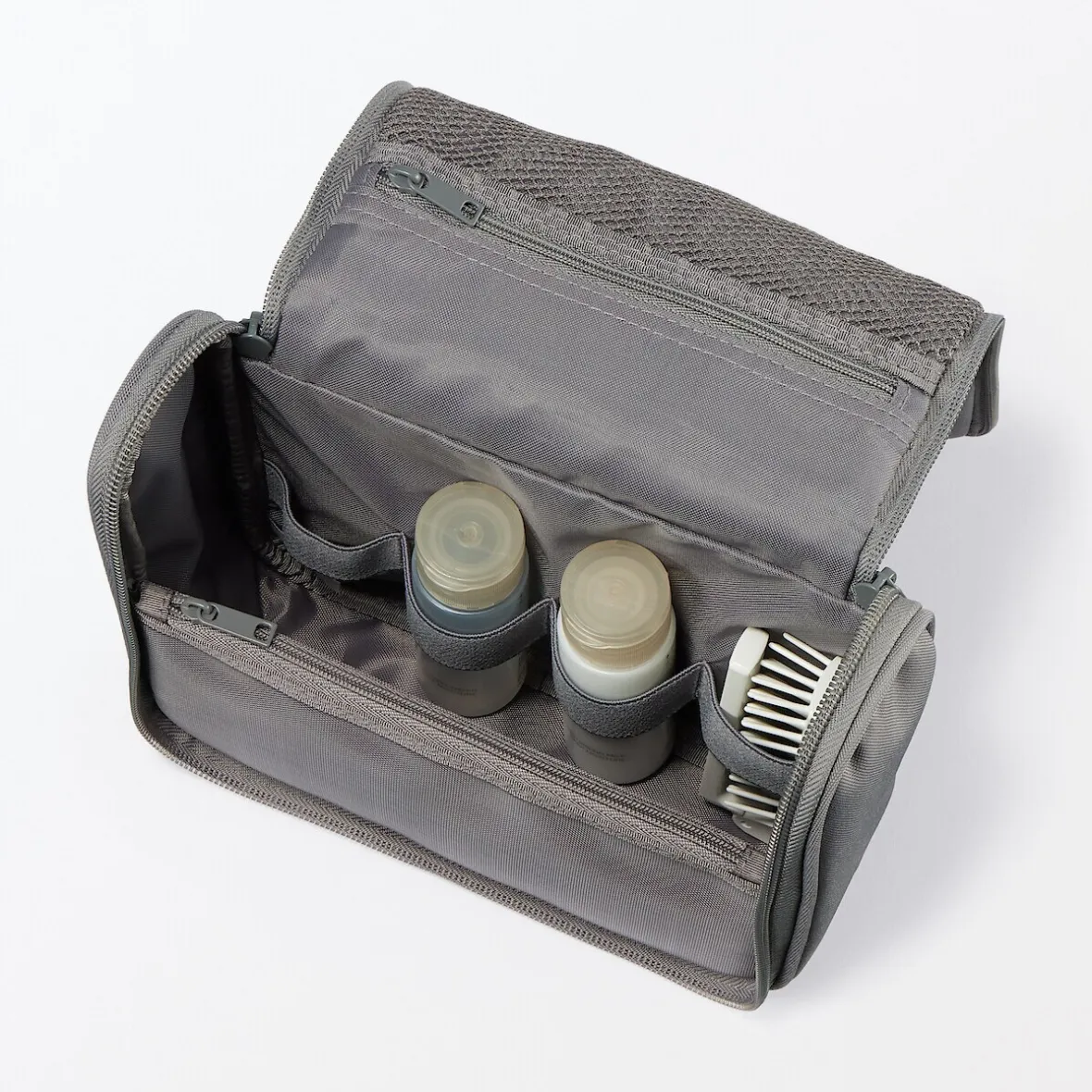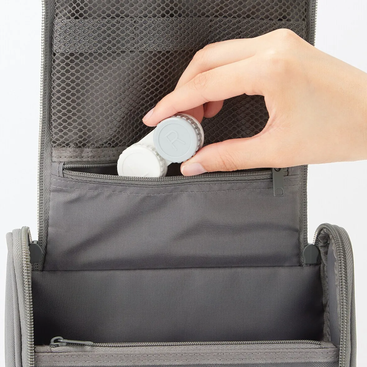 Déplié, cet étui peut être utilisé pour l’accrocher à un crochet dans la salle de bain. Sa taille peut contenir jusqu’à 200 ml de bouteilles de lotion. Dimensions (fermé) : 16 x 19 x 6 cm