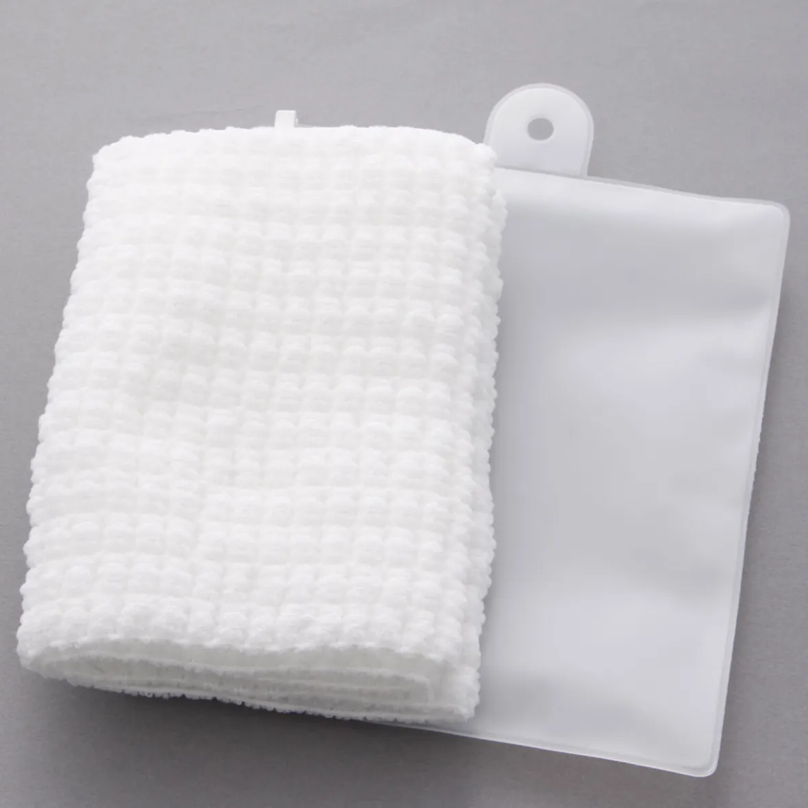 Une serviette pour le corps à la texture douce, accompagnée d’un étui en plastique EVA.