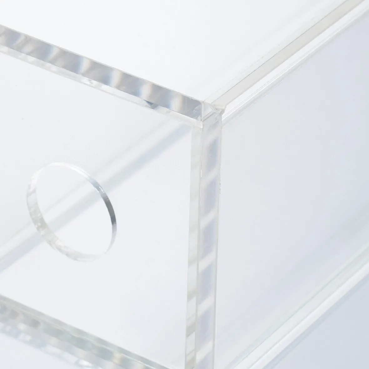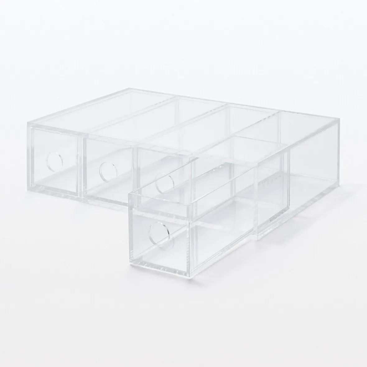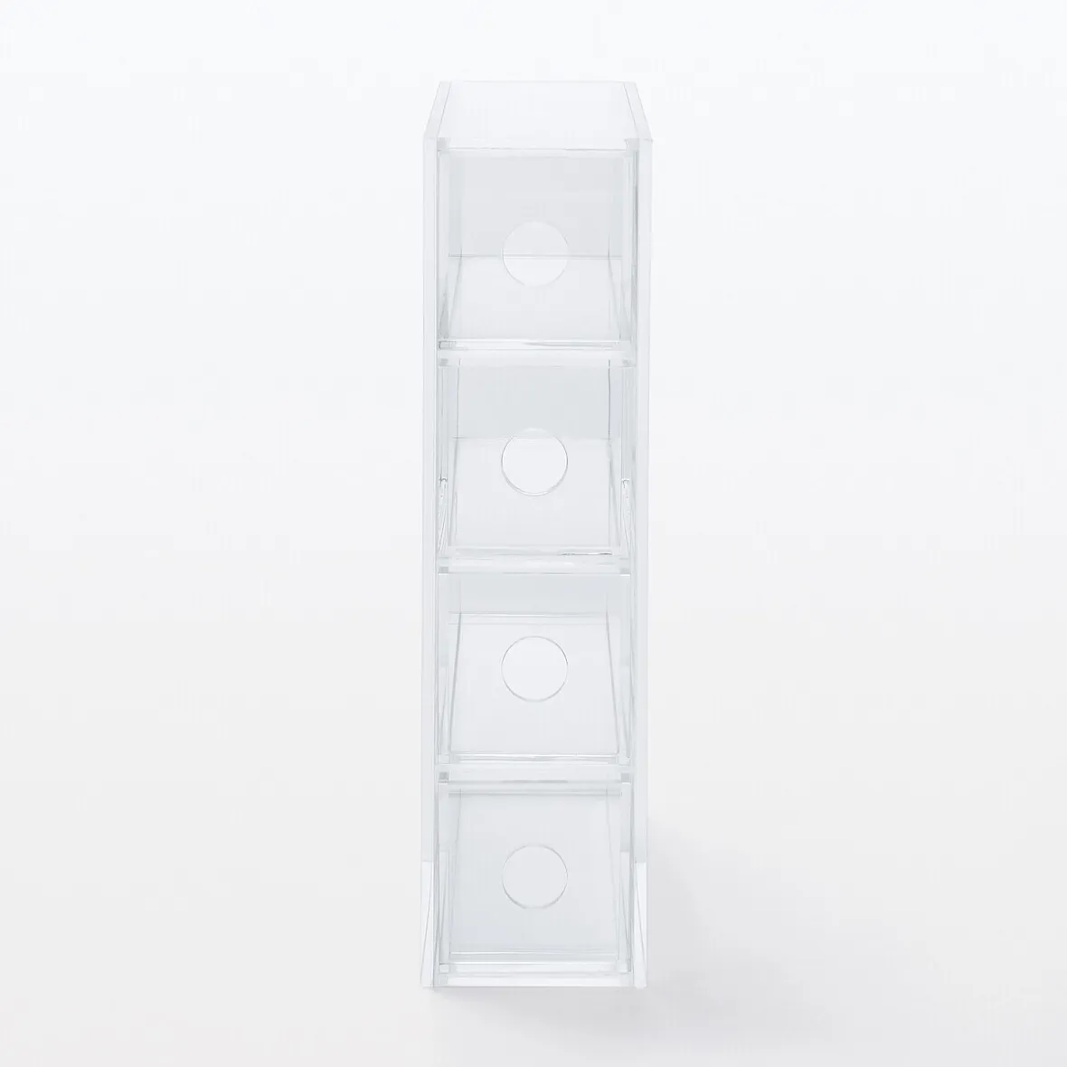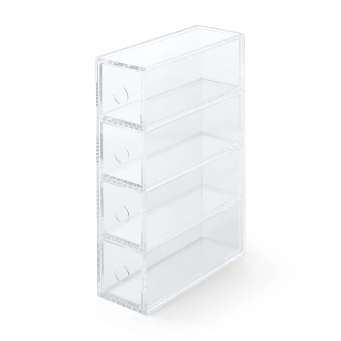 6.7 x 17.5 x 25cm. Boîte en acrylique 4 tiroirs, utilisable verticalement ou horizontalement. Idéale pour les lunettes, elle peut être utilisée également pour des pinceaux à maquillage, des articles de mercerie ou de couture, des crayons.