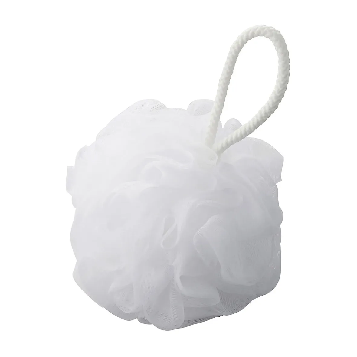 Fleur de douche blanche, filet synthétique, exfoliation douce. 2 tailles disponibles.