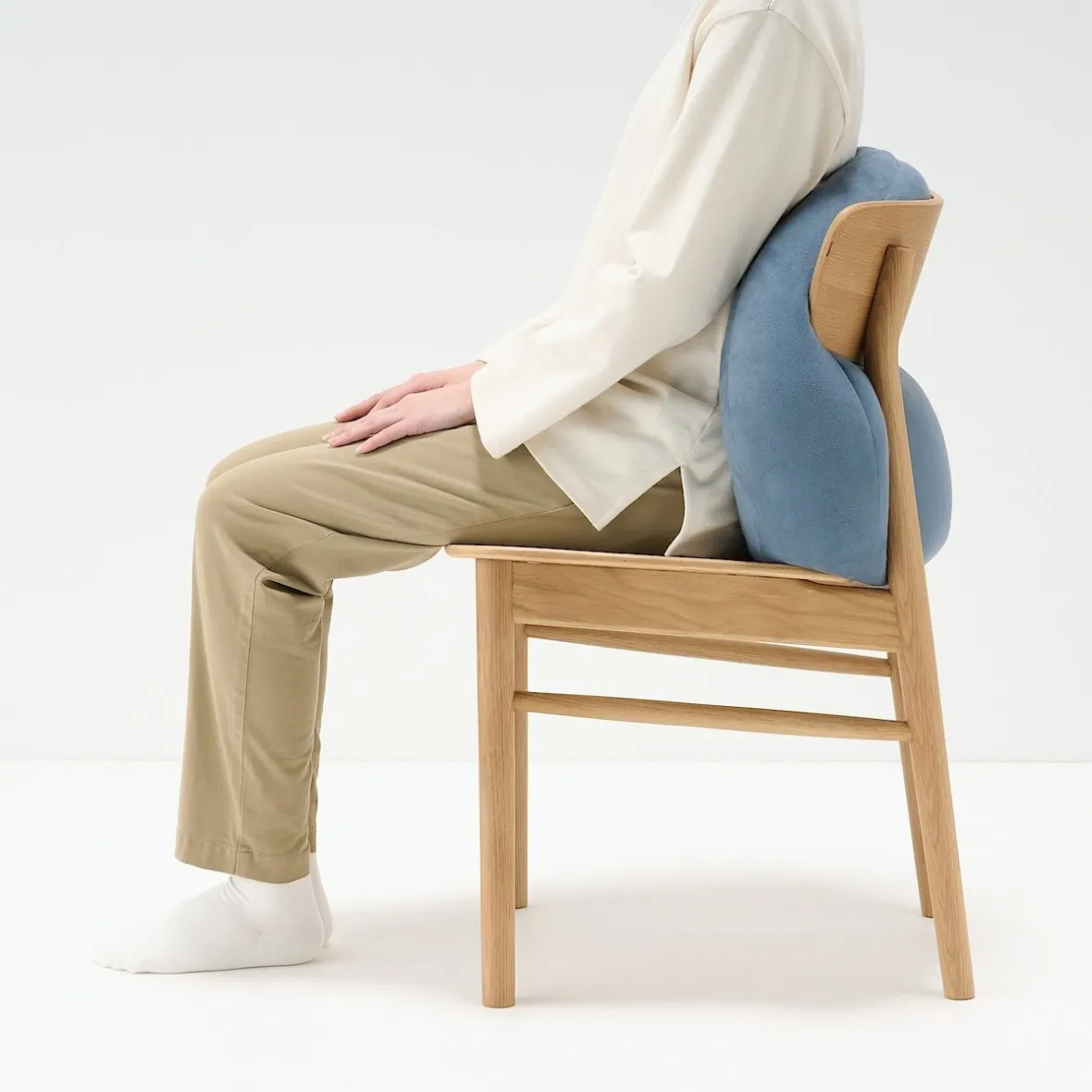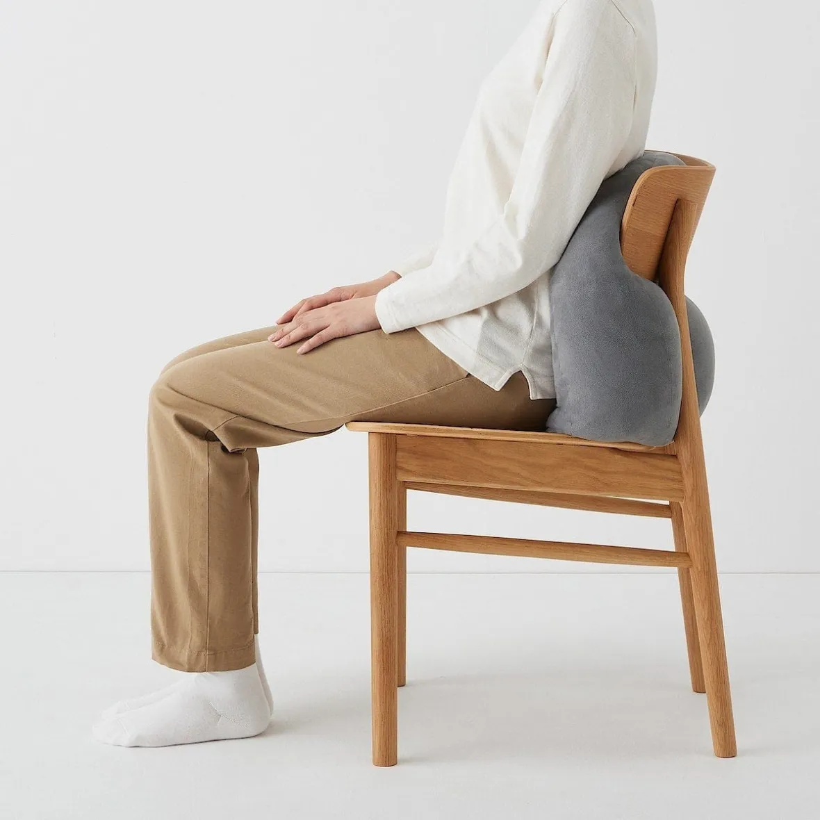 ‐ Placé verticalement sur une chaise, le coussin s’étend vers le haut et soutient la taille et le dos