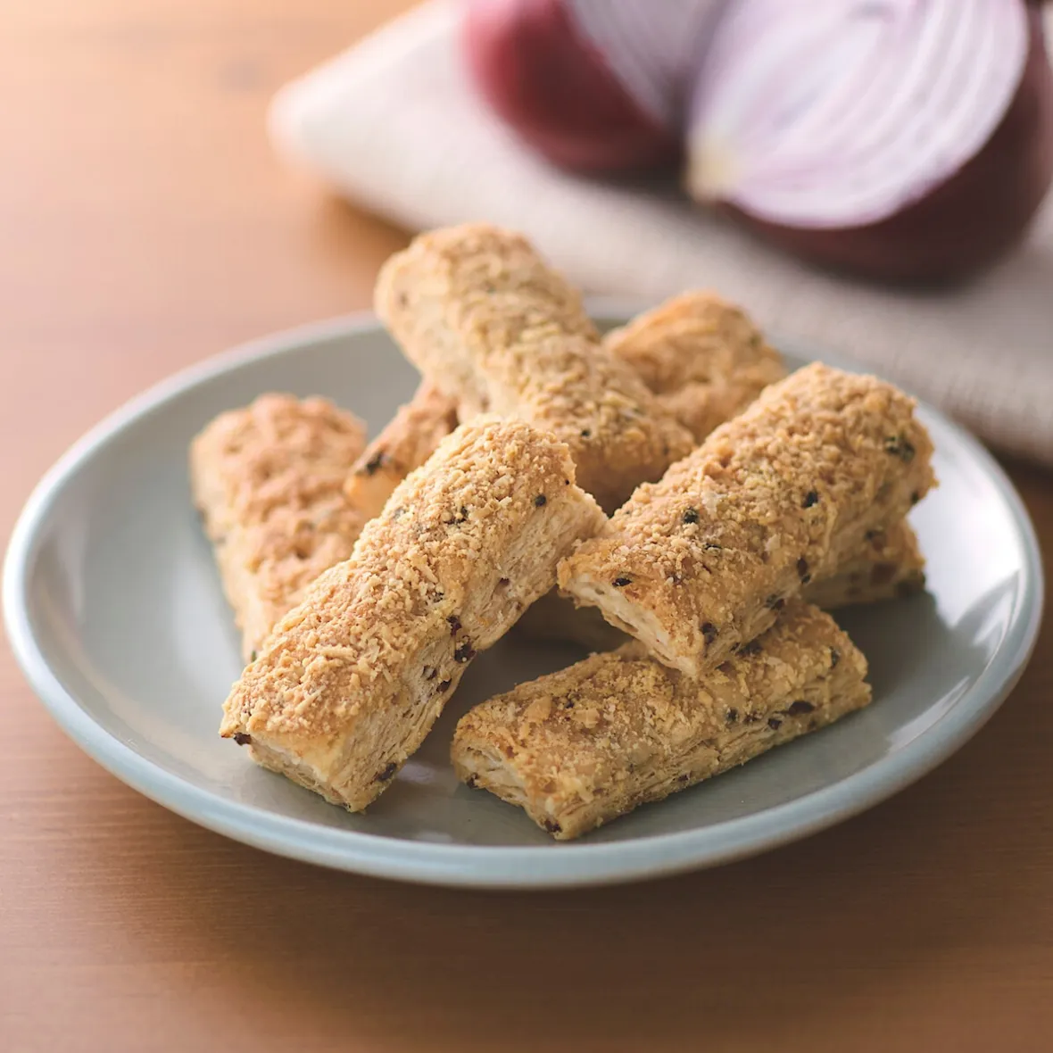 farine de froment (blé) (gluten), matières grasses végétales (palme, noix de coco) et huiles végétales (colza), fromage Gouda (lait) (12 %), morceaux d’oignon (3 %), sel, ail en poudre (0,6 %).