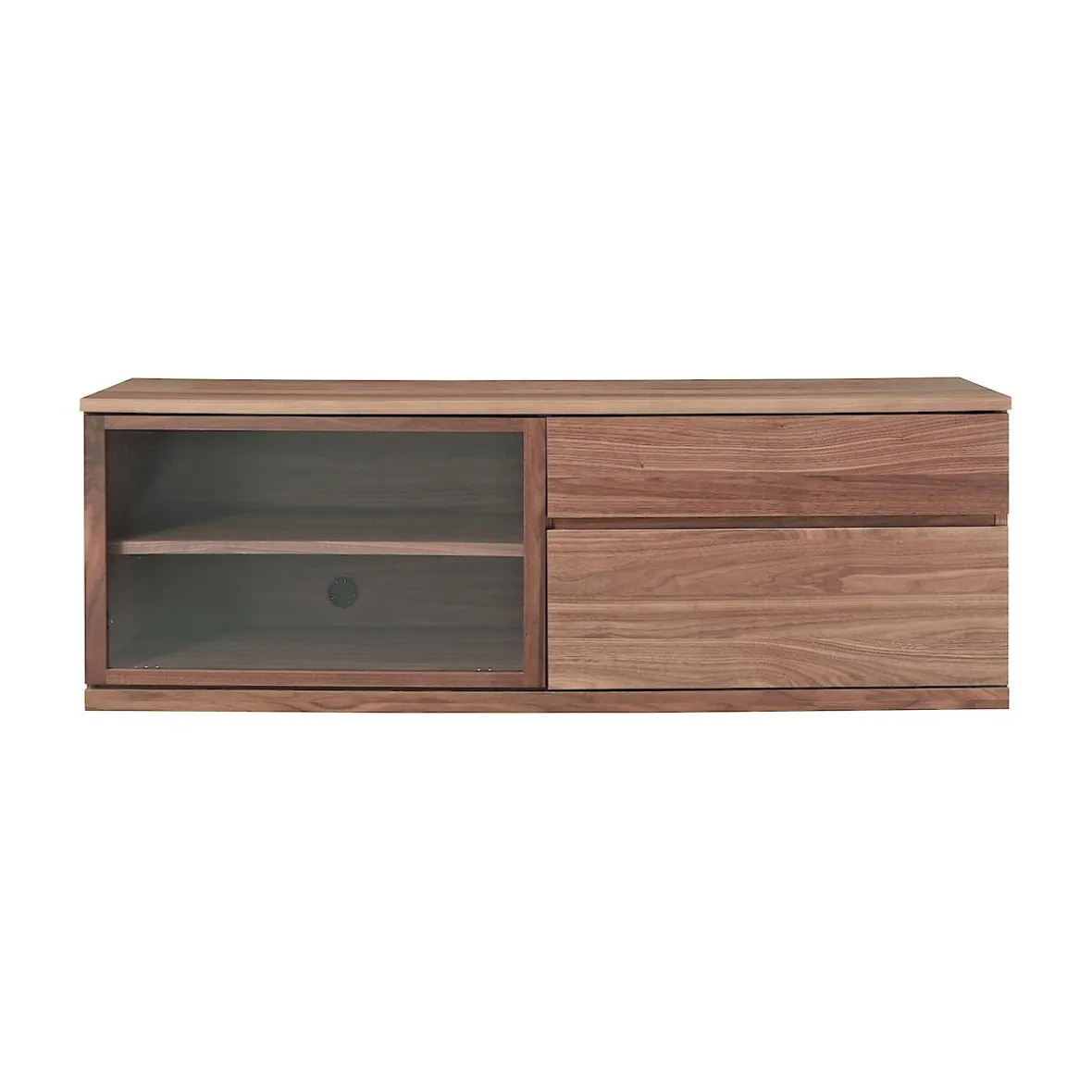 Un endroit pour les écrans et tout ce qui se cache derrière. Un meuble TV large en placage noyer avec un espace de rangement spacieux derrière une porte vitrée et deux tiroirs. Finition avec revêtement protecteur en uréthane transparent pour une utilisation de tous les jours.